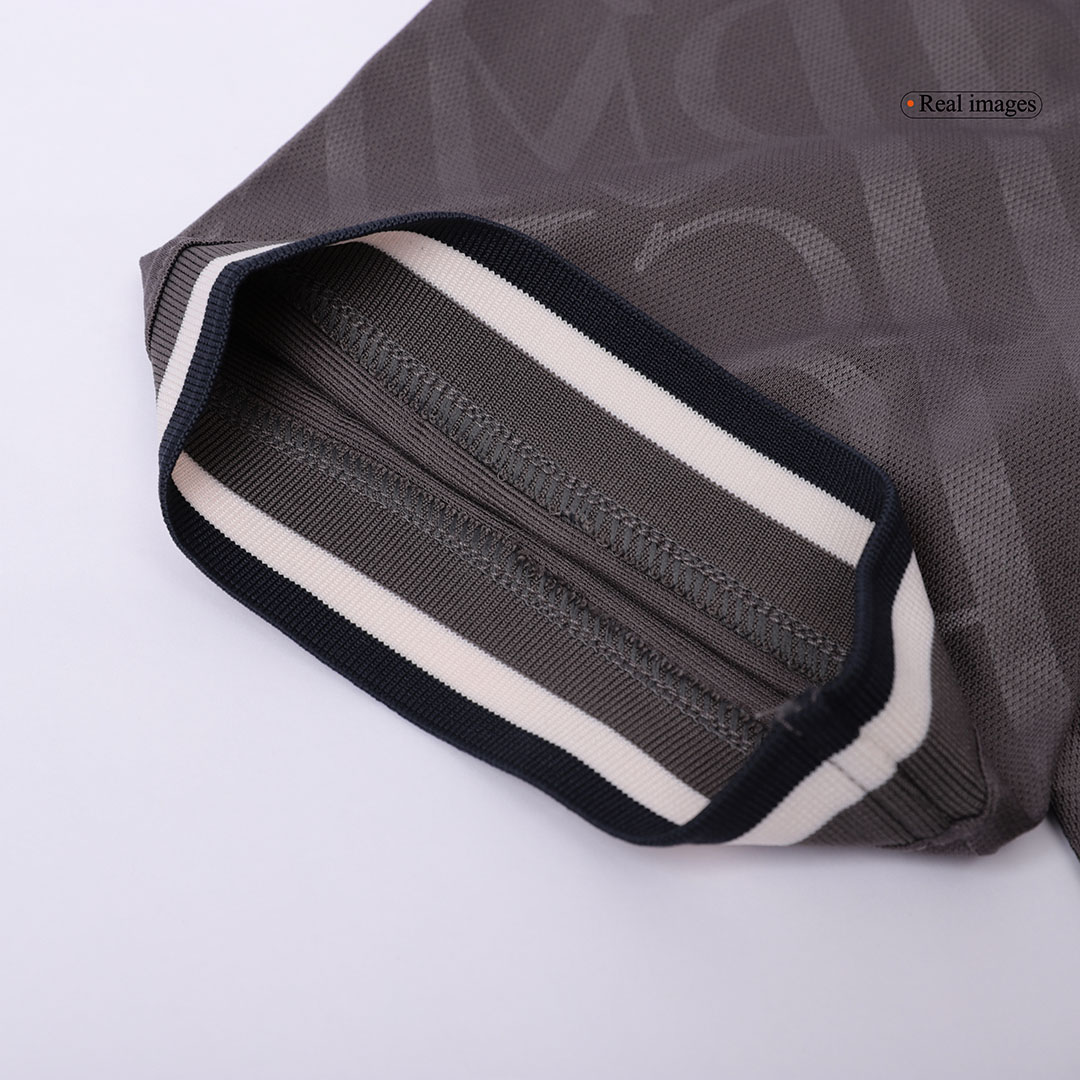 The Real Madrid 2024-25 third shirt has a charcoal brownish-grey (Charcoal) main color combined with 'RMCF embossing all over the shirt for a unique look.