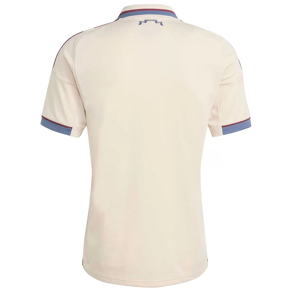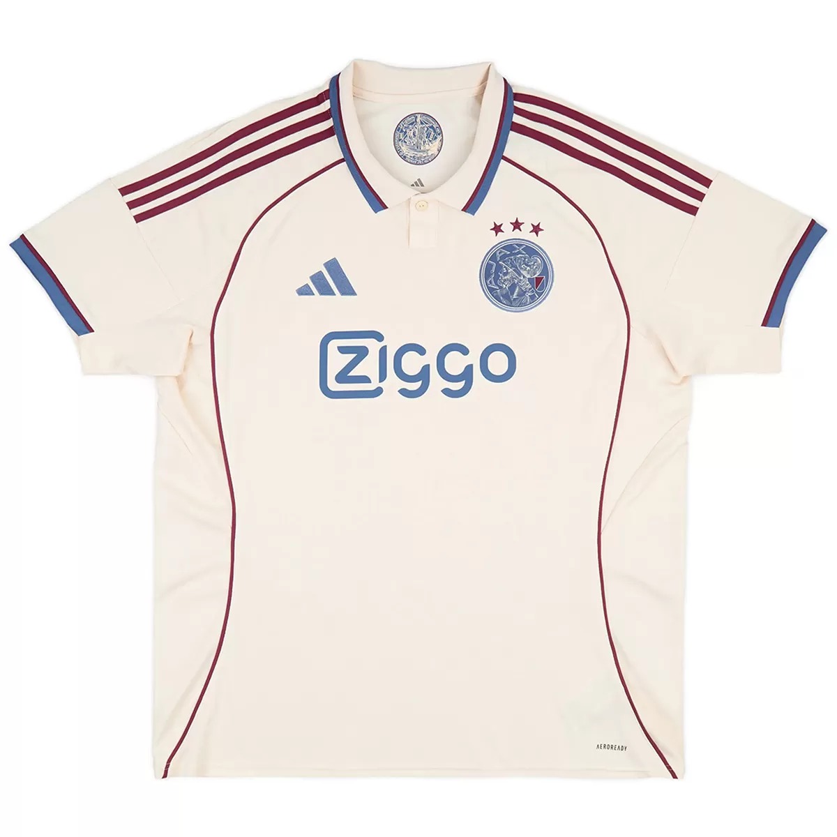 The Adidas Ajax 2025-26 third shirt is predominantly light beige (Halo Ivory). Adidas combines it with maroon for logos and navy/maroon for detailing.