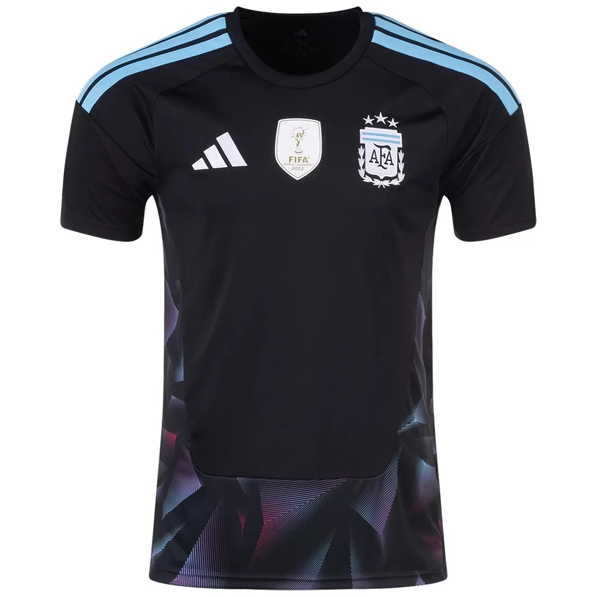Kit Design: The Argentina 2026 World Cup goalkeeper kit, made by Adidas, features a black base with white logos, sky blue stripes, and a 1990-inspired light blue and pink pattern on the lower panel and sides.