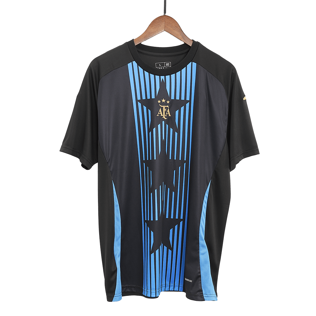 The Adidas Argentina Football Copa America 2024 pre-match jersey is black with a unique light blue stripes design that has cutouts that let the stars come out.