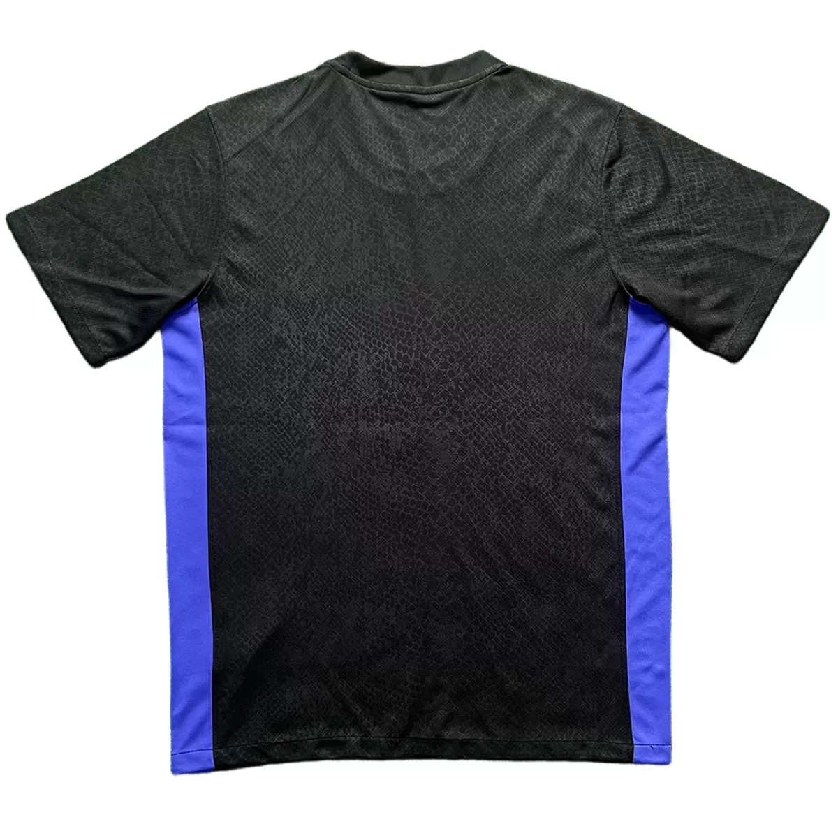The new Nike Mamba Barcelona 25-26 away collection is built around a sleek color palette of black and dark charcoal, accented with a vibrant purple/blue.