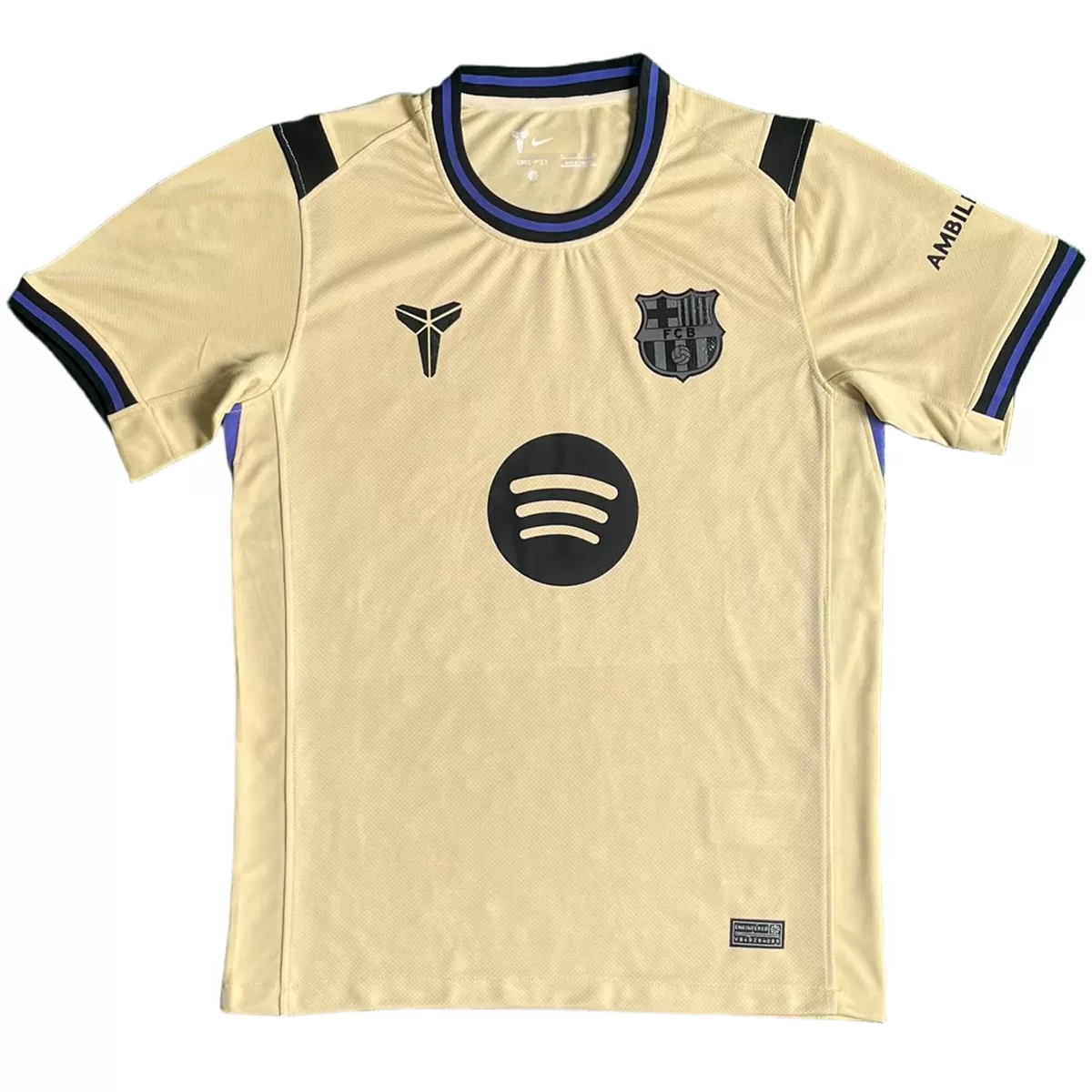 The Nike Mamba Barca 2025-26 away shirt features a light yellow-gold main color with black and purple accents.