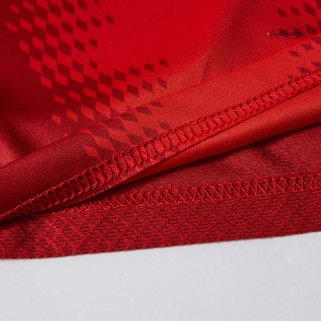 The Bayern Munich 2024-2025 home football jersey makes full use of the club's nickname, "Die Roten" (The reds), by having different shades of red only.