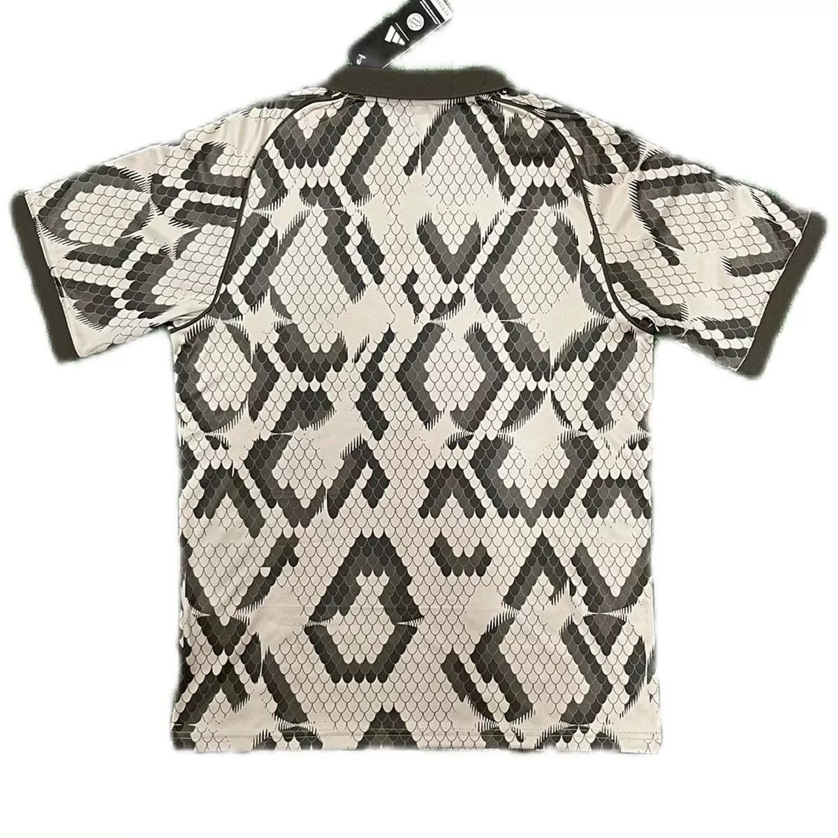 The Adidas x BSTN FC Bayern München 2025 collection centers around a distinctive beige lifestyle jersey featuring an abstract diamond pattern with dark accents, complemented by the BSTN sponsor logo prominently displayed on the chest. The iconic Bayern München crest appears in monochrome above the adidas logo.