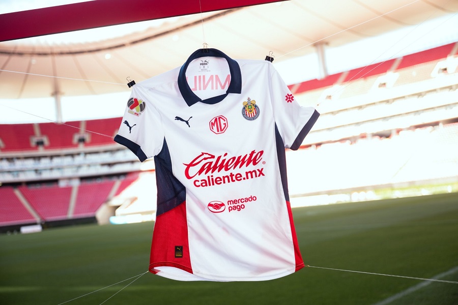 The Chivas 2024-2025 away shirt is mainly white with navy/red logos and applications.