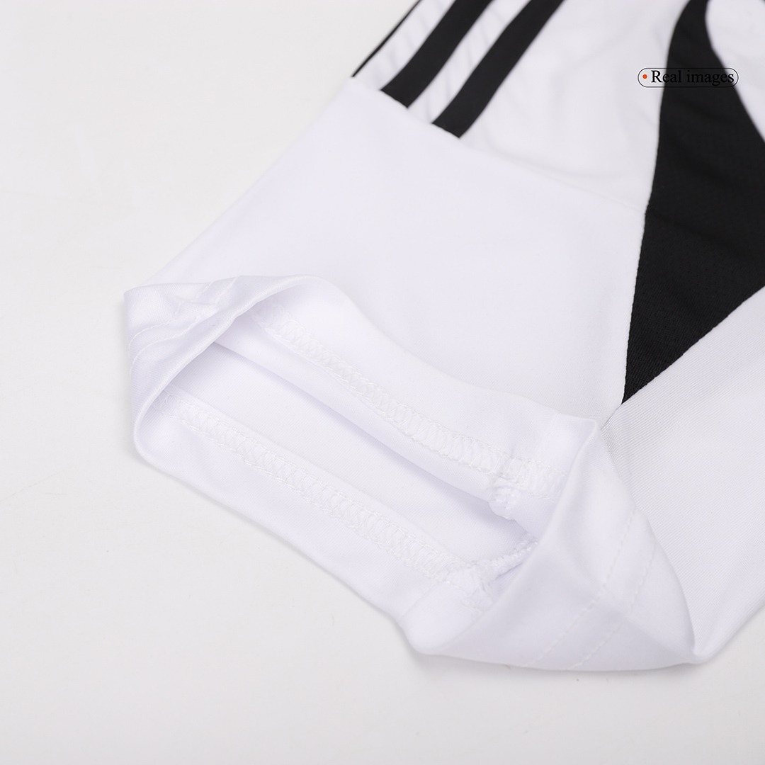 The new Juventus 2024-25 home football jersey is a traditional white and black with two large black vertical stripes running across the Brand logo and Juventus crest.
