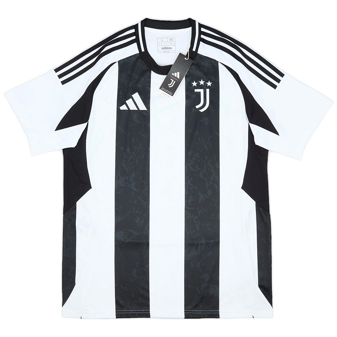 The new Juventus 2024-25 home football jersey is a traditional white and black with two large black vertical stripes running across the Brand logo and Juventus crest.