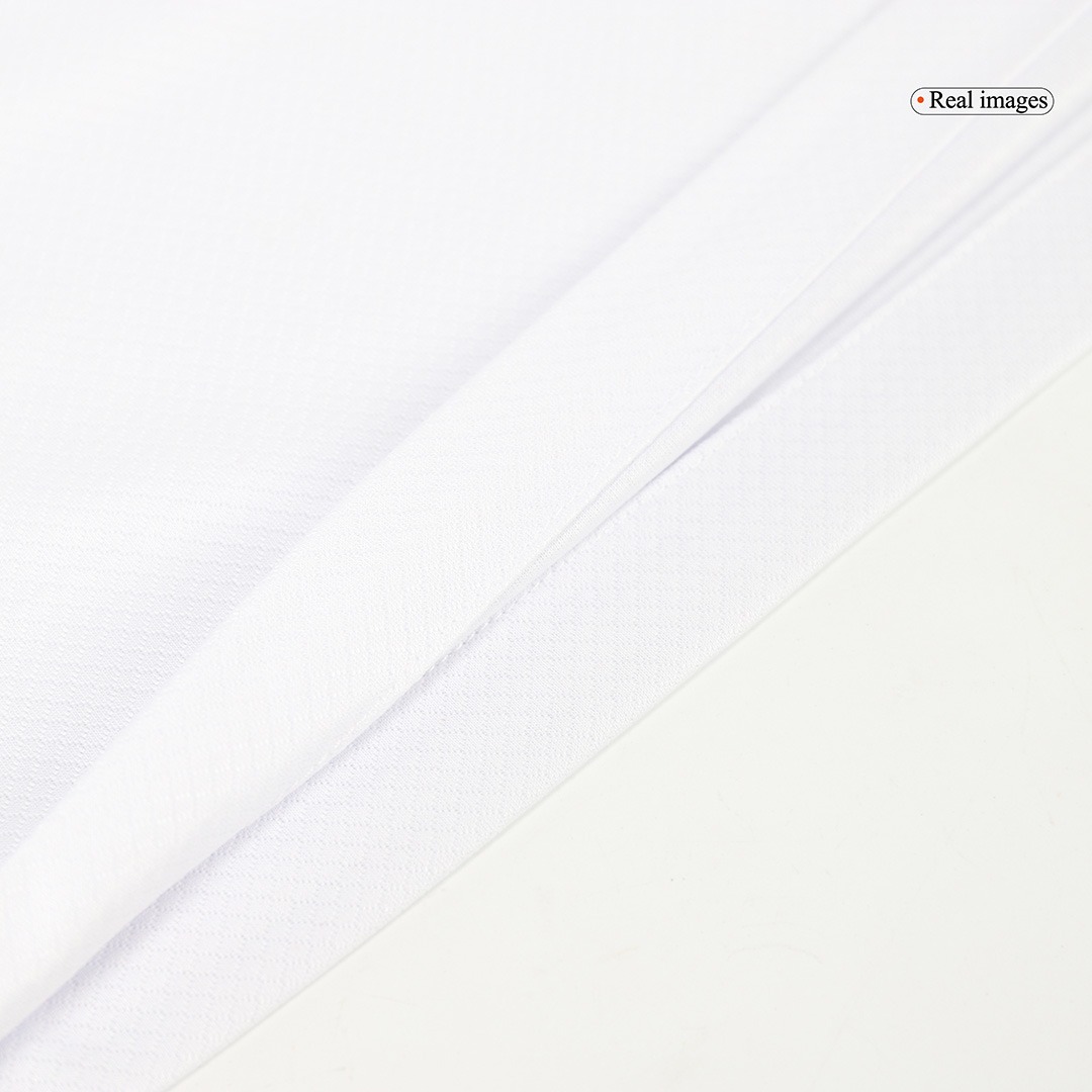The PSG 2024-2026 away shirt is white, blue, and red. What makes the kit outstanding is the design.