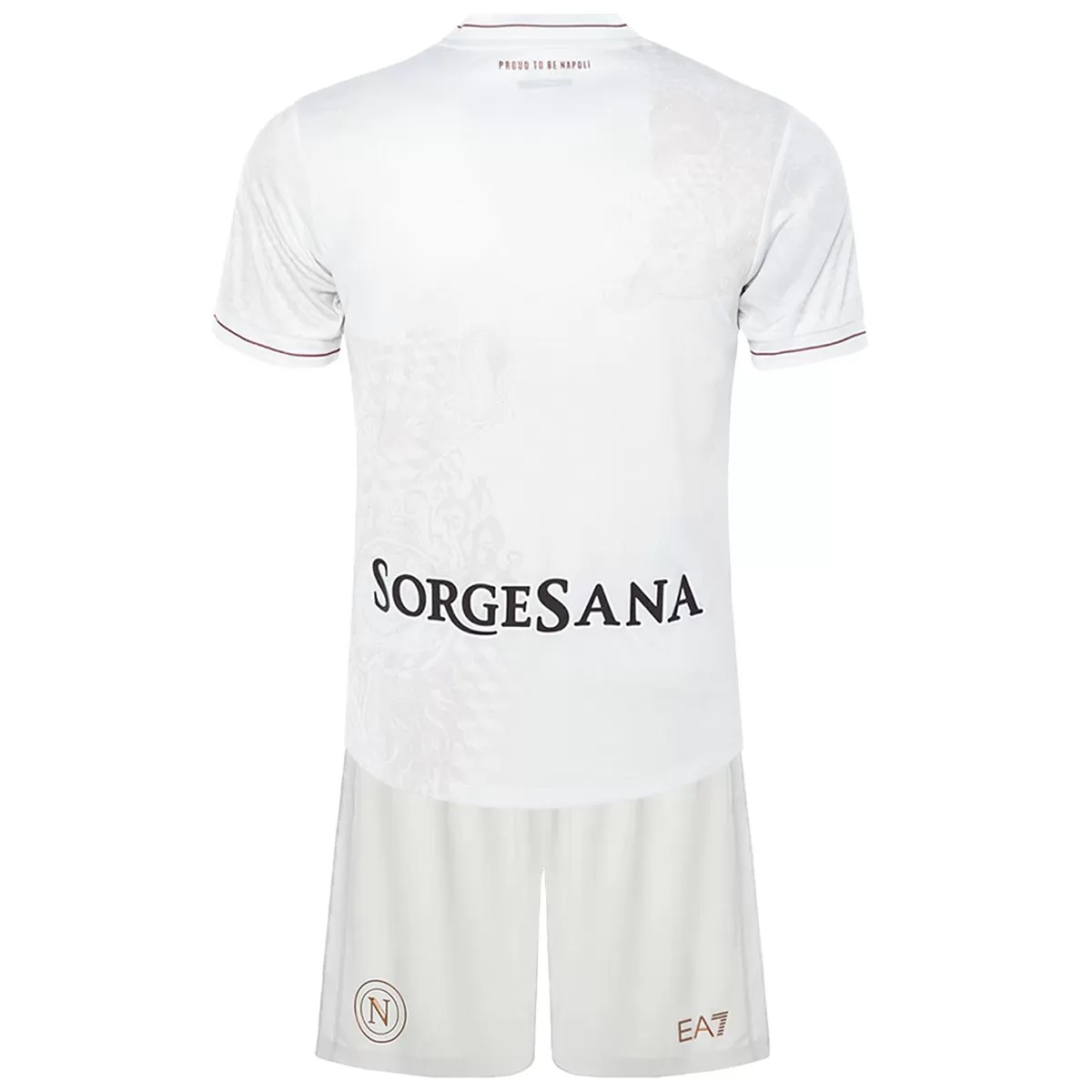 The EA7 SSC Napoli 2025-26 away shirt is off-white (cream) and features a bright tonal graphic inspired by the culture and symbols of Naples.