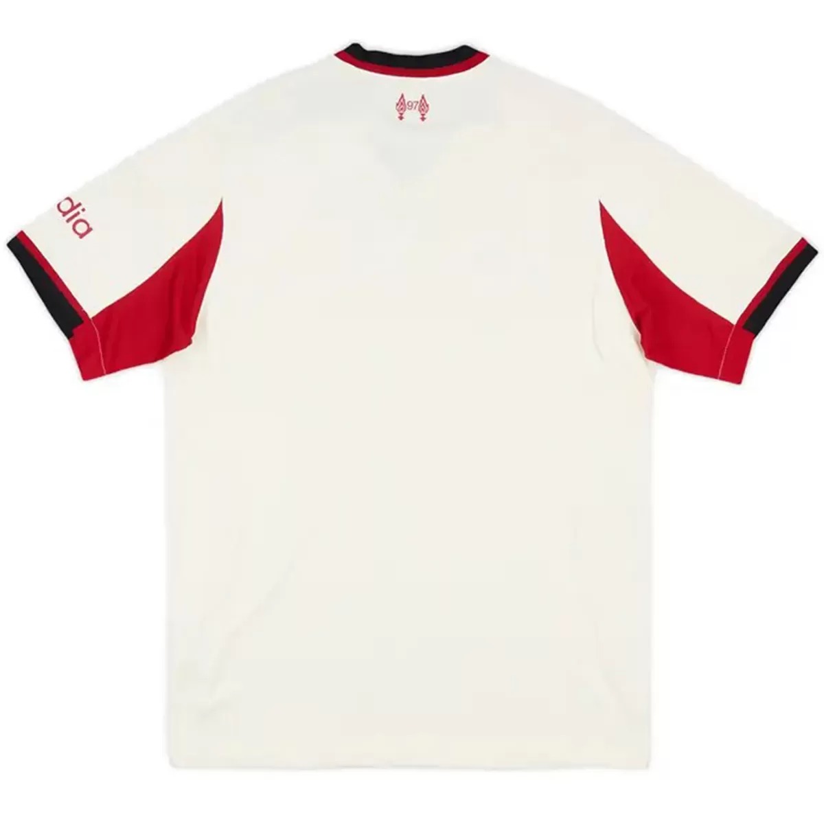 The Adidas Liverpool 2025-2026 away jersey features a clean and modern design, combining a light Wonder White base with bold Red and Black accents.