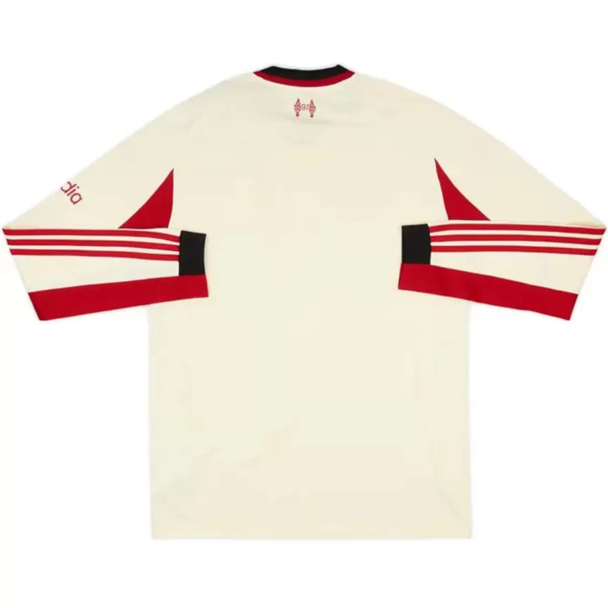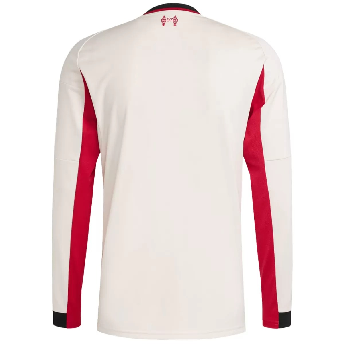 The Adidas Liverpool 2025-2026 away jersey features a clean and modern design, combining a light Wonder White base with bold Red and Black accents.