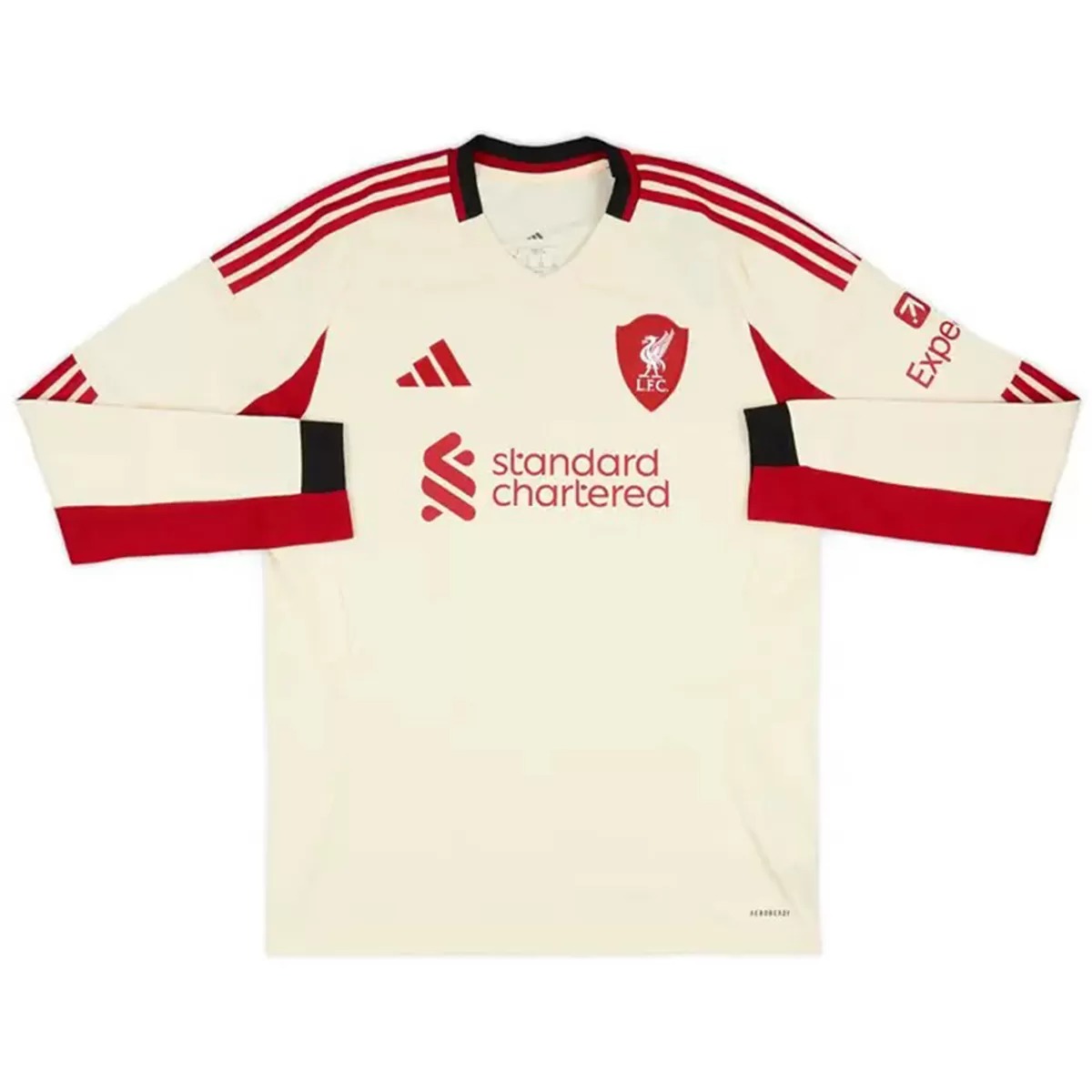 The Adidas Liverpool Football Club 25-26 away jersey is mainly off-white, with red Adidas logo and sleeve detailing, paired with black shorts and white socks.
