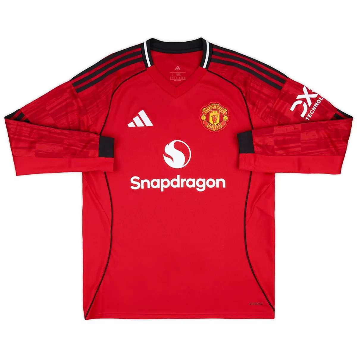 The Adidas Manchester United 2025-26 home shirt is predominantly red with white logos.