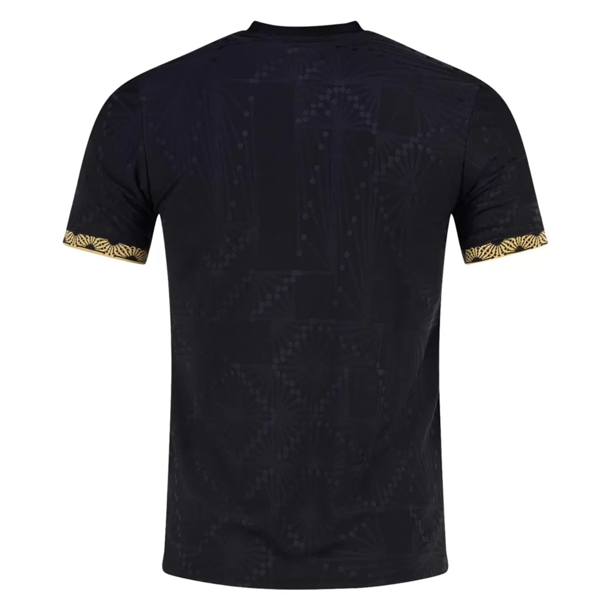 The Adidas Mexico 2025 Gold Cup football jersey is black with gold accents, a break from the usual colors of the country.