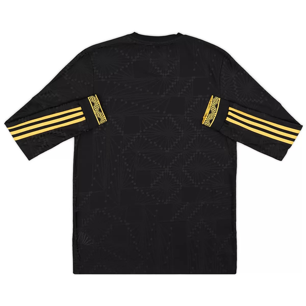 The Adidas Mexico 2025 Gold Cup football jersey is black with gold accents, a break from the usual colors of the country.