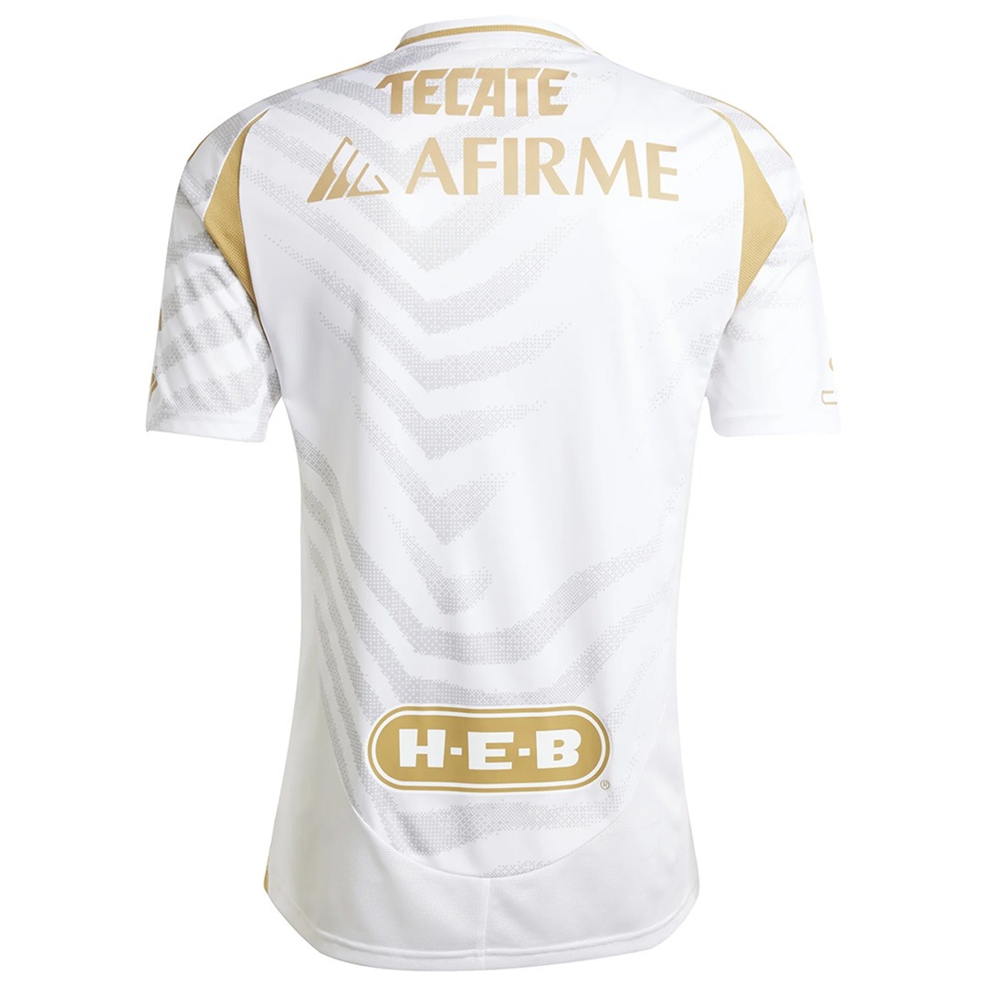 The Tigres 2024-2025 third shirt is predominantly white with a light grey tiger skin pattern.