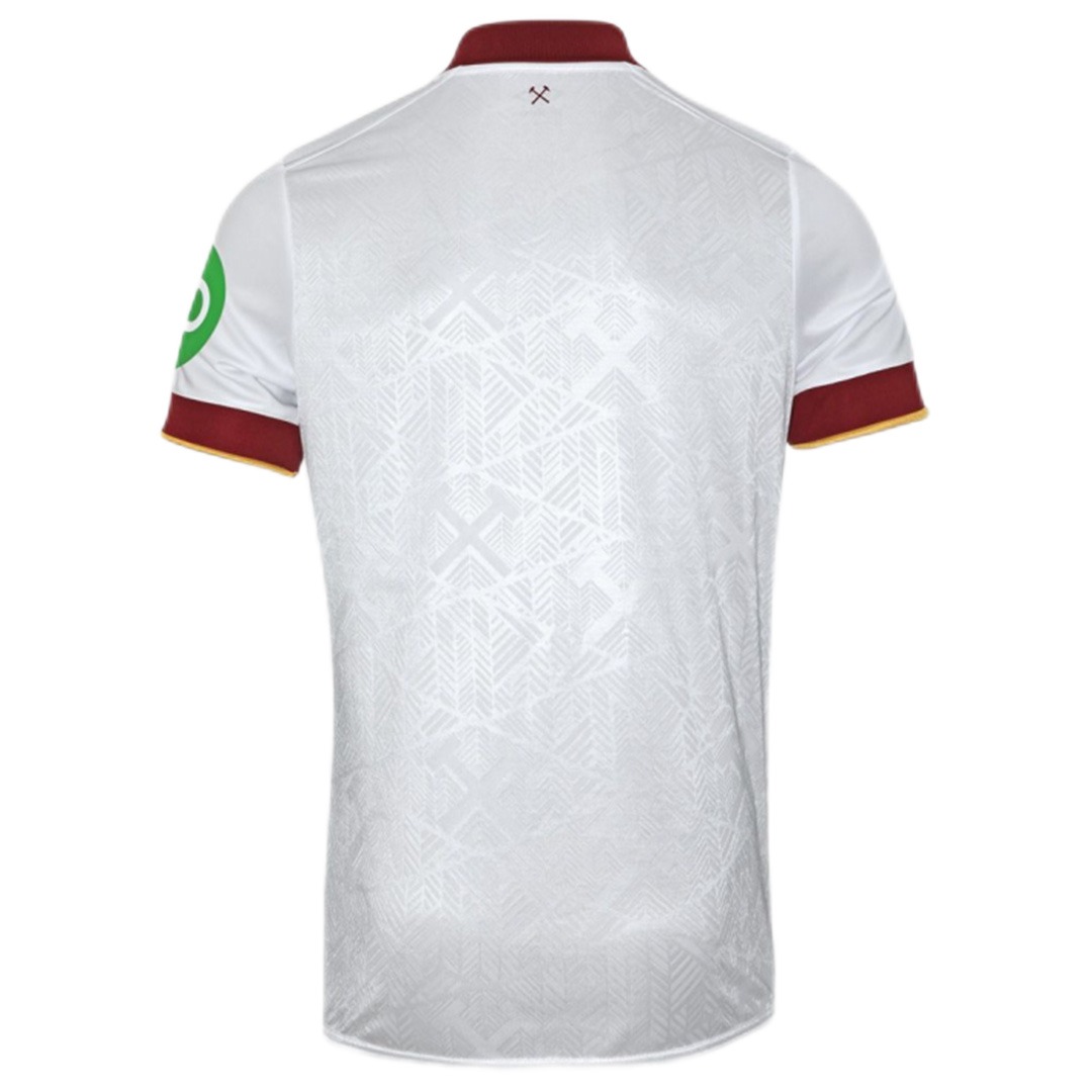 The West Ham United 2024-2025 third jersey is predominantly white, combined with a burgundy polo collar and burgundy cuffs with gold trim for a clean and elegant look.