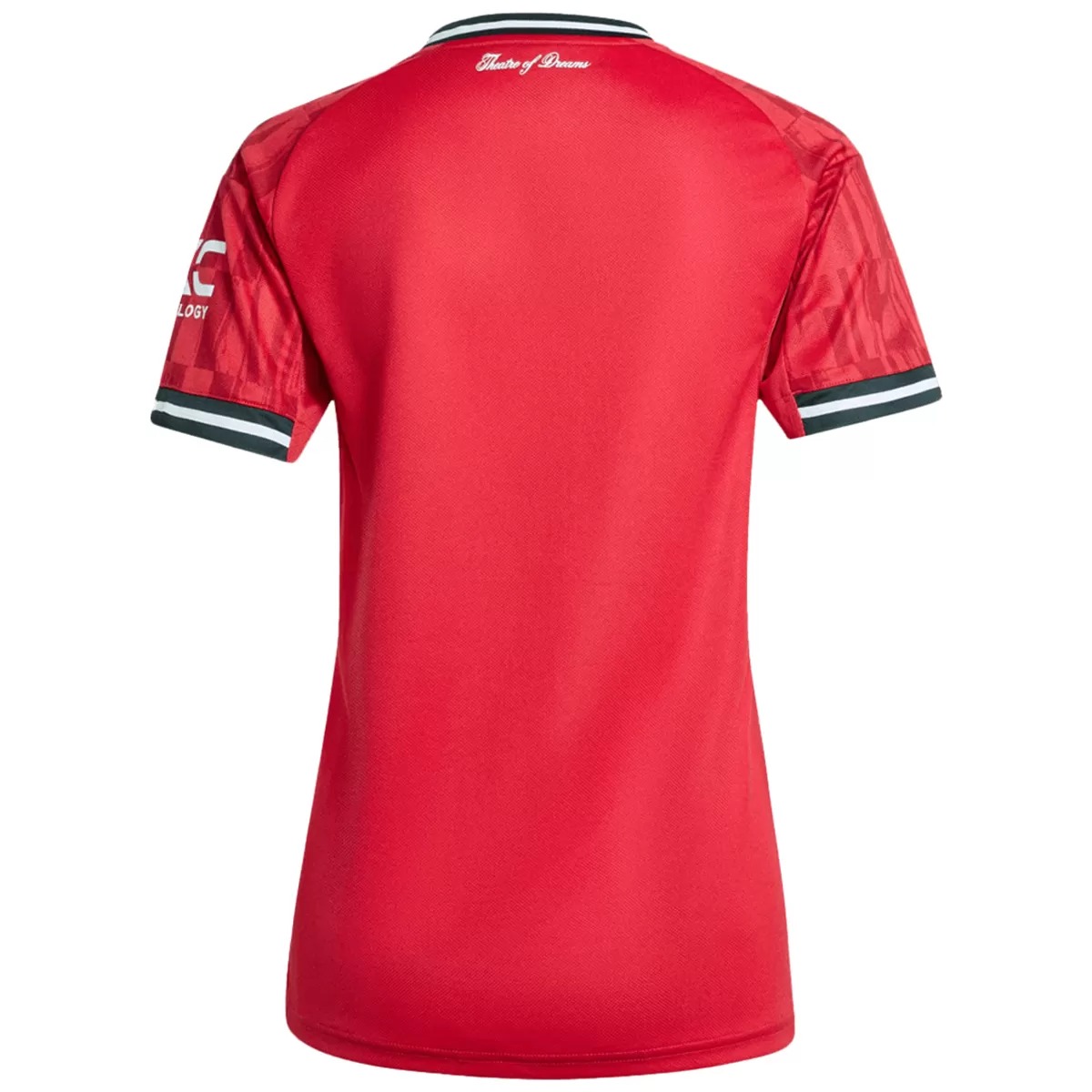 The Adidas Manchester United 2025-26 home shirt is predominantly red with white logos.