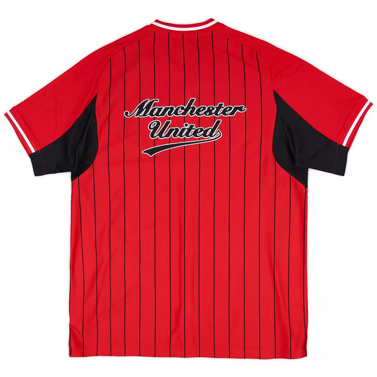 The new Adidas Manchester United 25-26 baseball jersey features a full button-down front and pinstripe design — hallmarks of baseball uniforms.